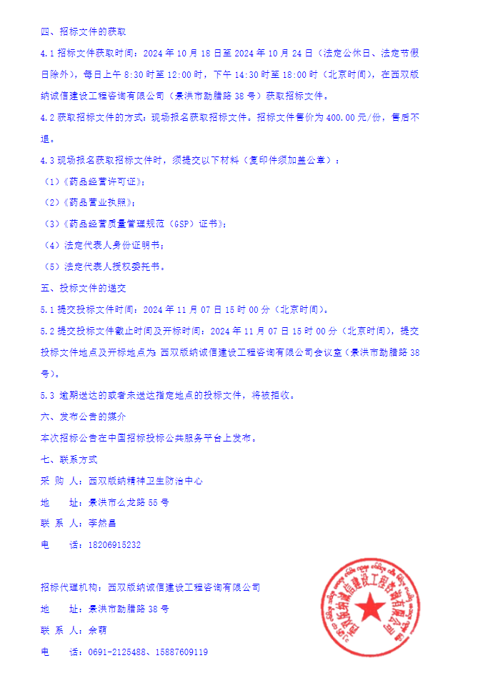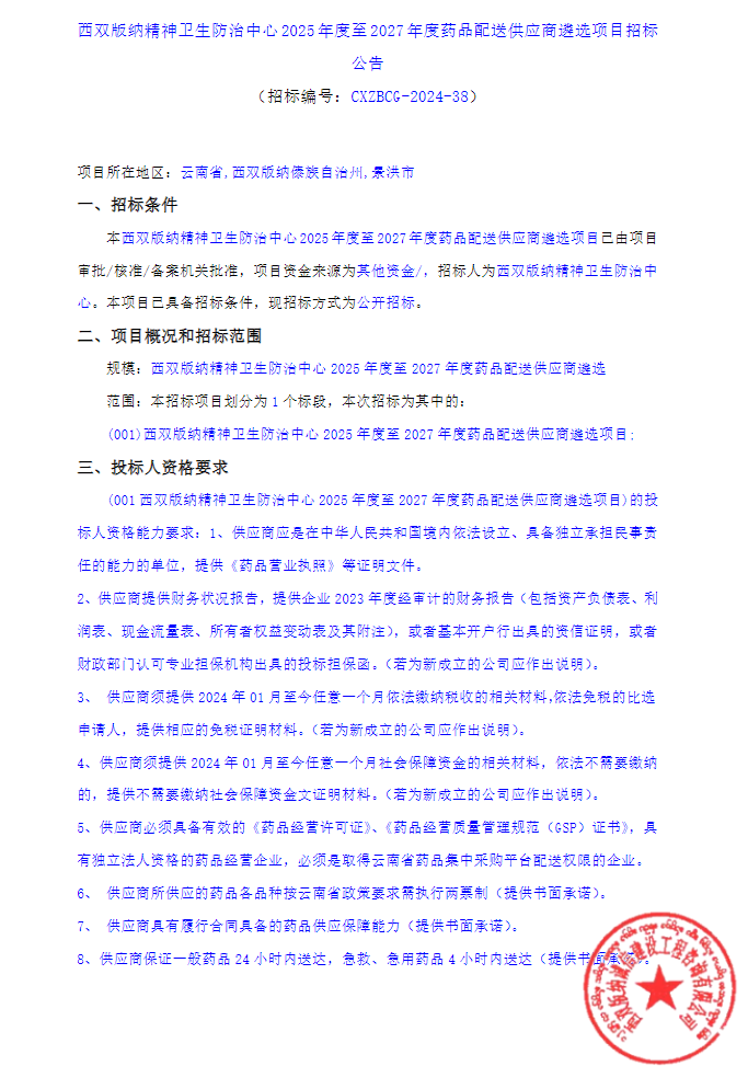 【西双版纳精神卫生防治中心】云南省西双版纳精神卫生防治中心2025年度至2027年度药品配送供应商遴选项目招标公告