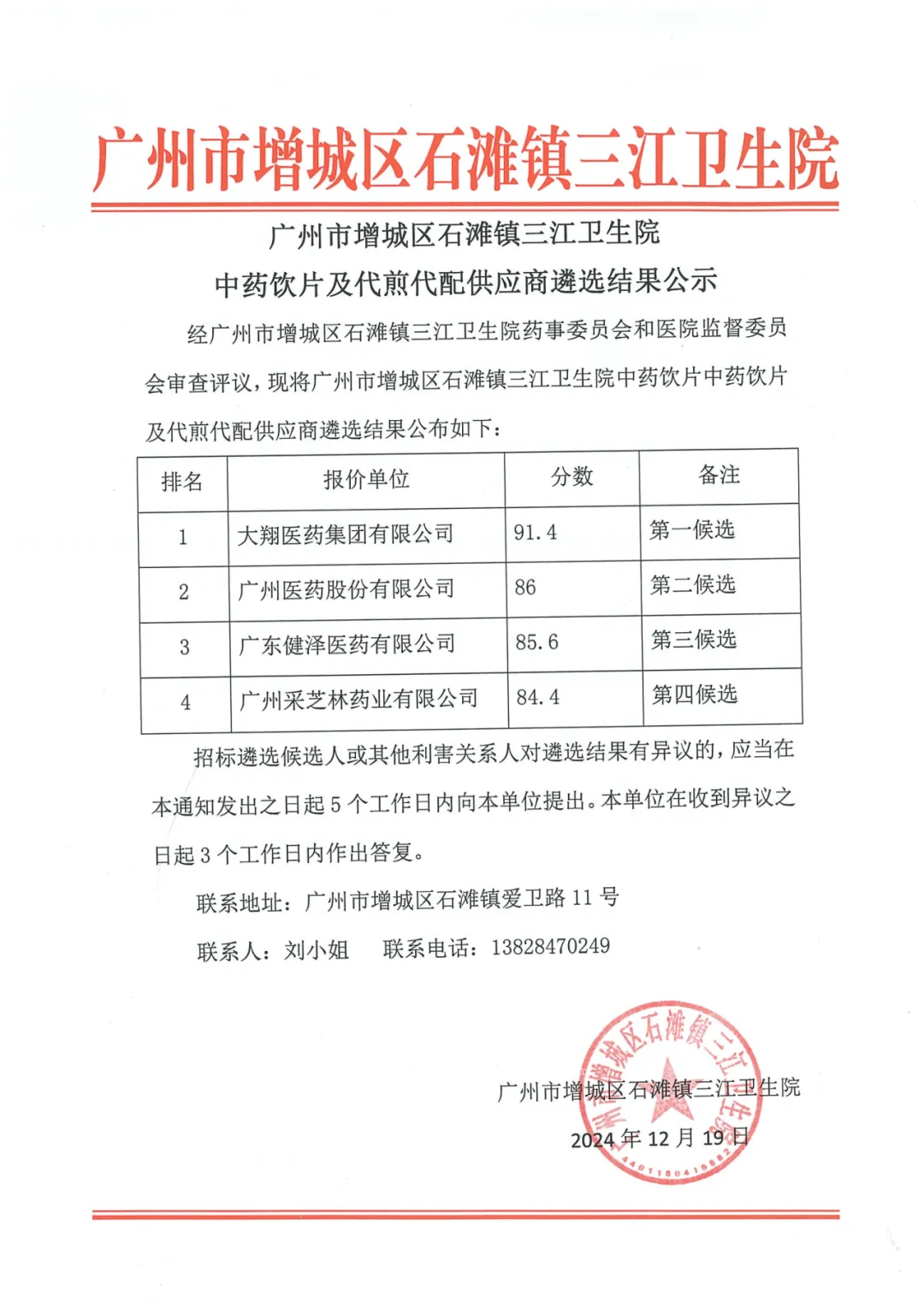 【广州市增城区石滩镇三江卫生院】广东省广州市增城区石滩镇三江卫生院中药饮片及代煎代配供应商遴选结果公示