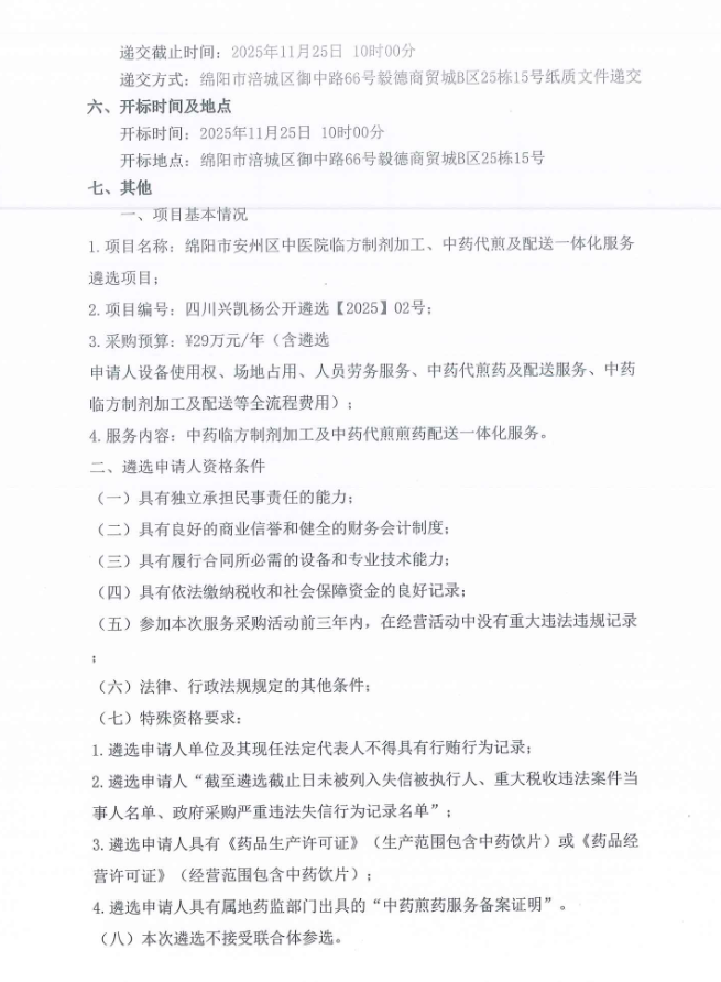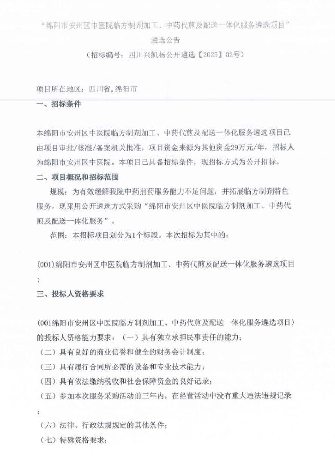 【绵阳市安州区中医院】四川省“绵阳市安州区中医院临方制剂加工、中药代煎及配送一体化服务遴选项目”遴选公告