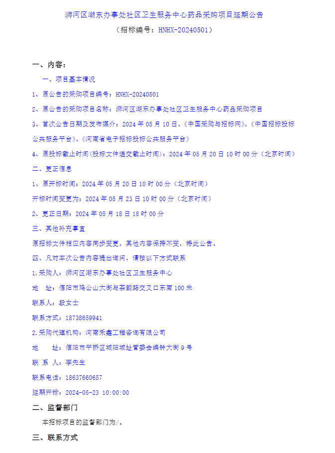 【信阳市浉河区湖东办事处社区卫生服务中心】河南省信阳市浉河区湖东办事处社区卫生服务中心药品采购项目延期公告