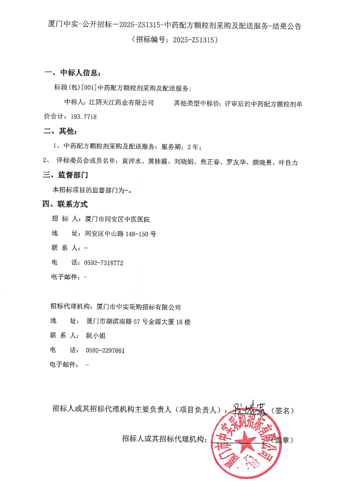 【厦门市同安区中医医院】福建省厦门中实-公开招标-2025-ZS1315-中药配方颗粒剂采购及配送服务-结果公告