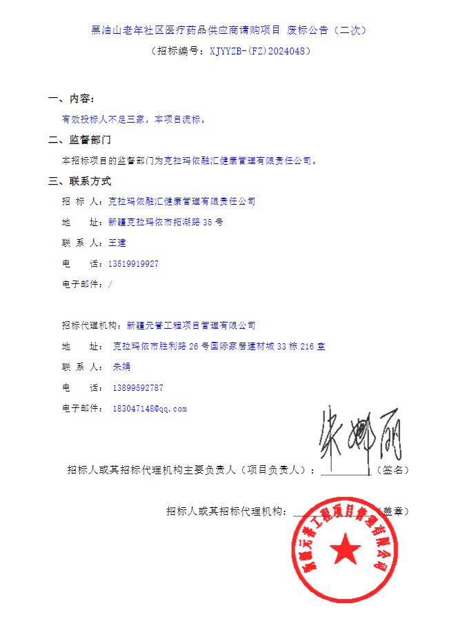【克拉玛依市黑油山老年社区】新疆维吾尔自治区克拉玛依市黑油山老年社区医疗药品供应商请购项目废标公告(二次)
