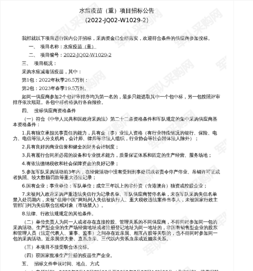 【军队采购】水痘疫苗(重)招标公告(2022-JQ02-W1029-2)