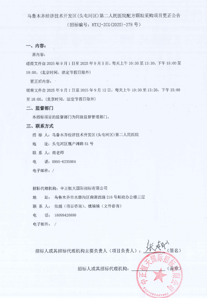 【乌鲁木齐经济技术开发区(头屯河区)第二人民医院】新疆维吾尔自治区乌鲁木齐经济技术开发区(头屯河区)第二人民医院配方颗粒采购项目更正公告