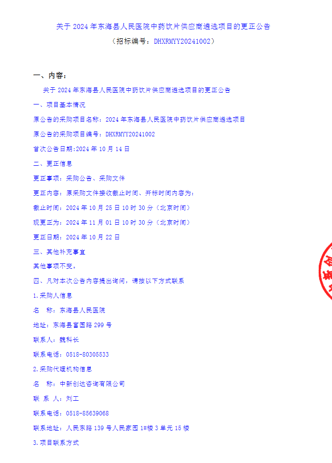 【连云港市东海县人民医院】江苏省连云港市关于2024年东海县人民医院中药饮片供应商遴选项目的更正公告