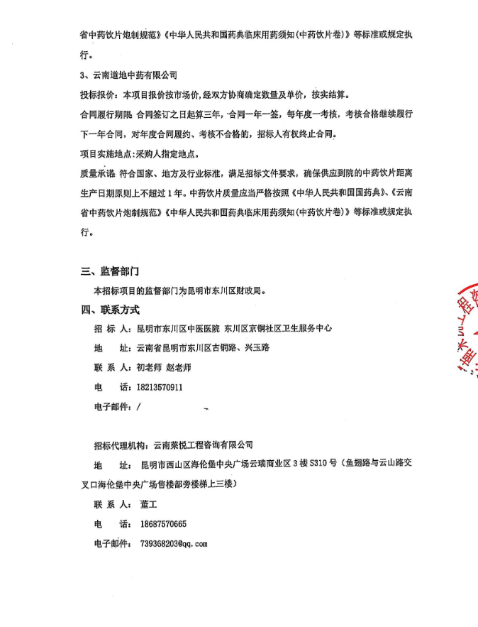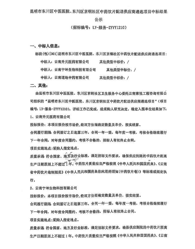 【昆明市东川区中医医院】云南省昆明市东川区中医医院、东川区京铜社区中药饮片配送供应商遴选项目中标结果公示
