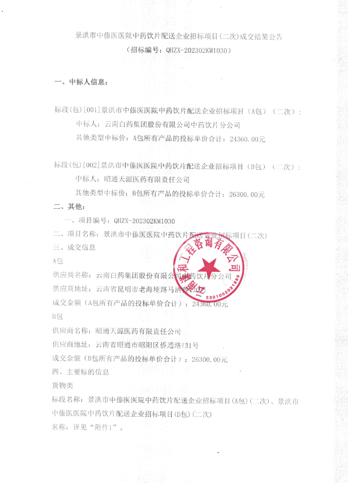 【景洪市中傣医医院】云南省西双版纳傣族自治州景洪市中傣医医院中药饮片配送企业招标项目(二次)成交结果公告
