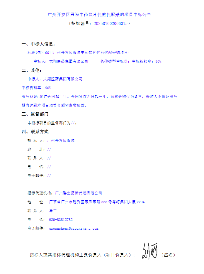 【广州开发区医院】广东省广州开发区医院中药饮片代煎代配采购项目中标公告