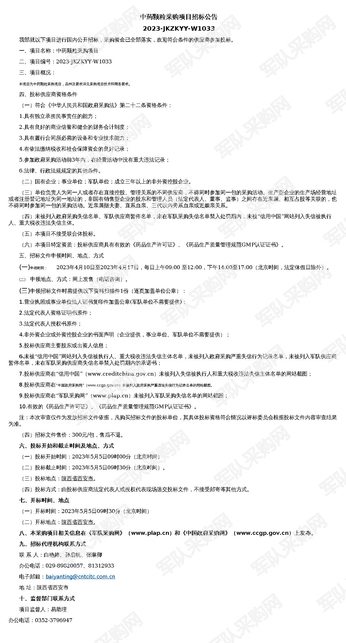 【军队采购】军队采购网中药颗粒采购项目(2023-JKZKYY-W1033)
