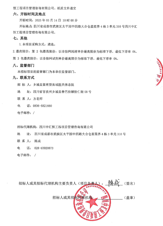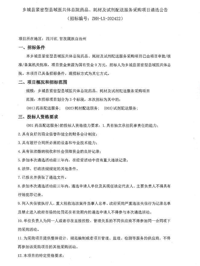【甘孜藏族自治州乡城县紧密型县域医共体总院】四川省甘孜藏族自治州乡城县紧密型县域医共体总院药品、耗材及试剂配送服务采购项目遴选公告