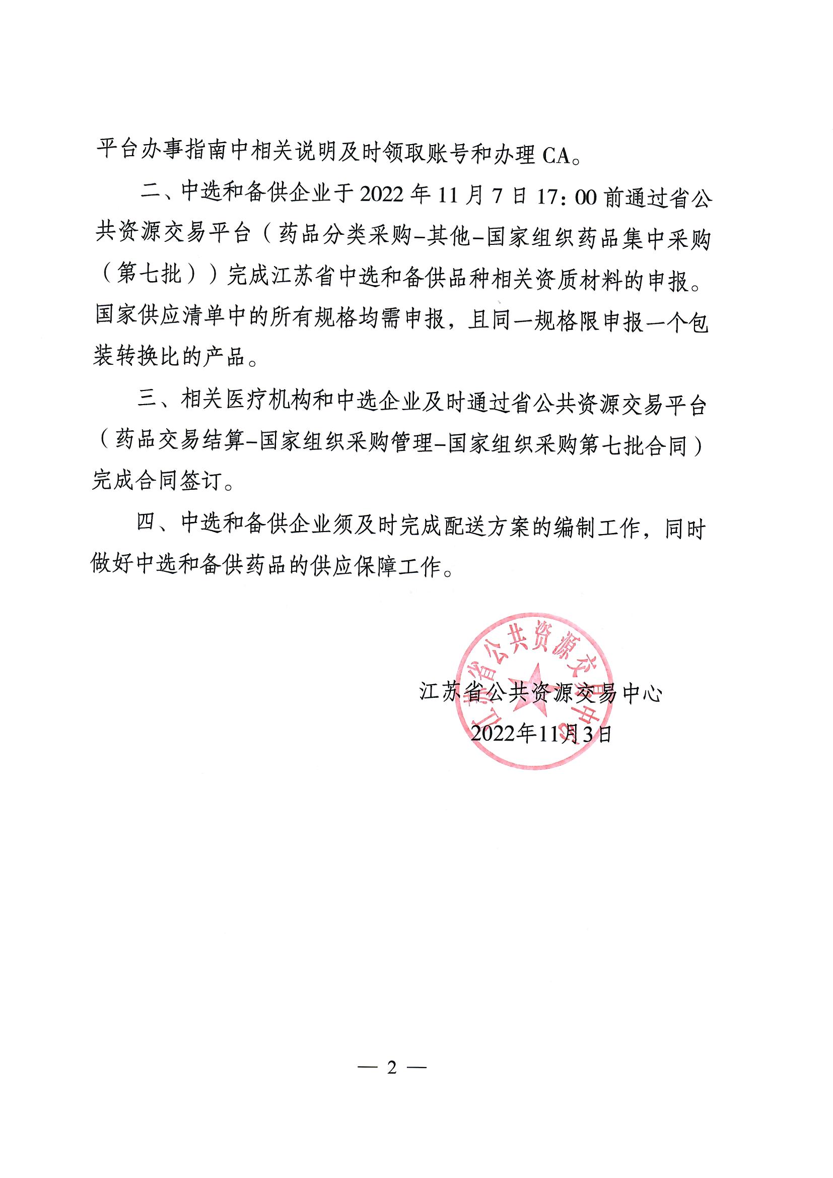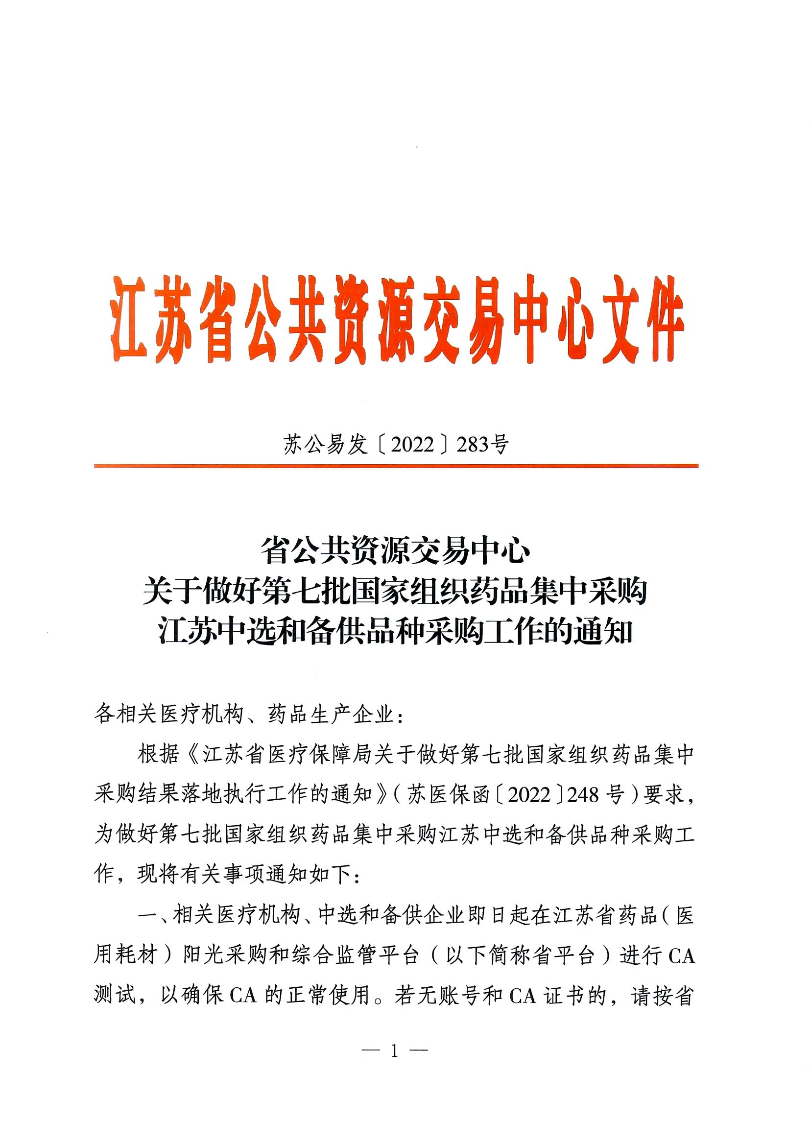 【江苏】省公共资源交易中心关于做好第七批国家组织药品集中采购江苏中选和备供品种采购工作的通知