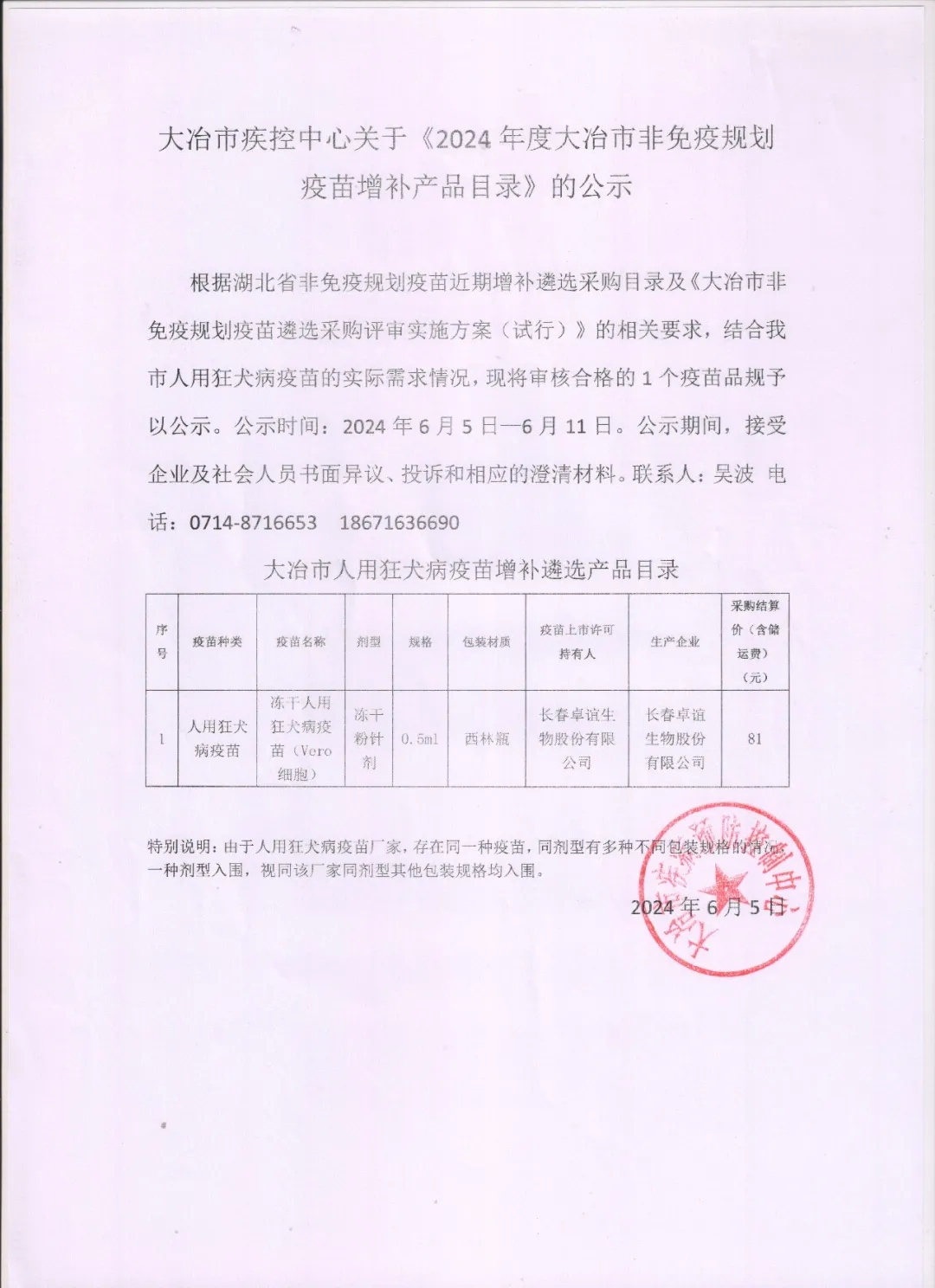 【黄石】大冶市疾控中心关于《2024年度大冶市非免疫规划疫苗增补产品目录》的公示