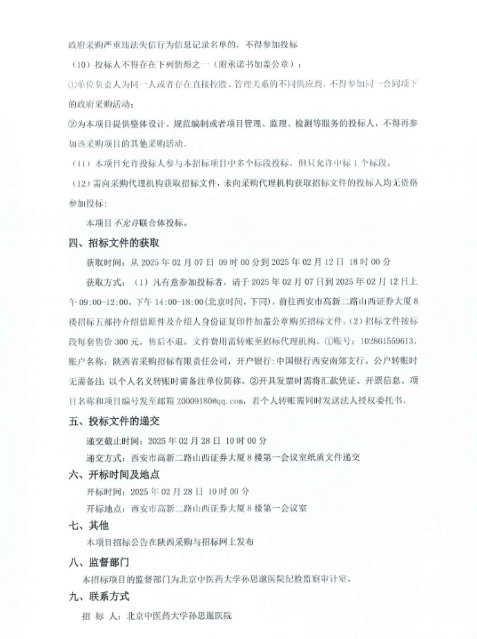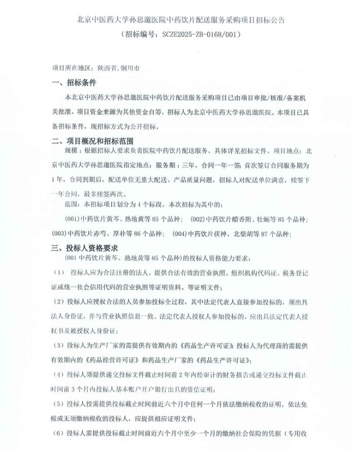 【北京中医药大学孙思邈医院】陕西省北京中医药大学孙思邈医院中药饮片配送服务采购项目招标公告