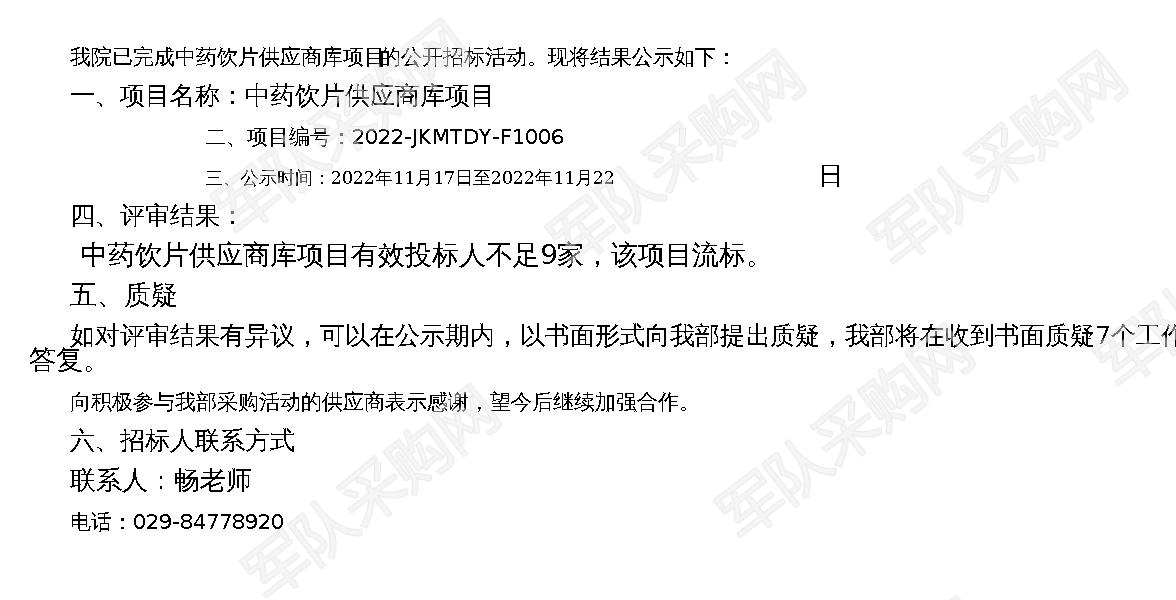 【军队采购】军队采购网中药饮片供应商库项目招标结果公示(2022-JKMTDY-F1006)