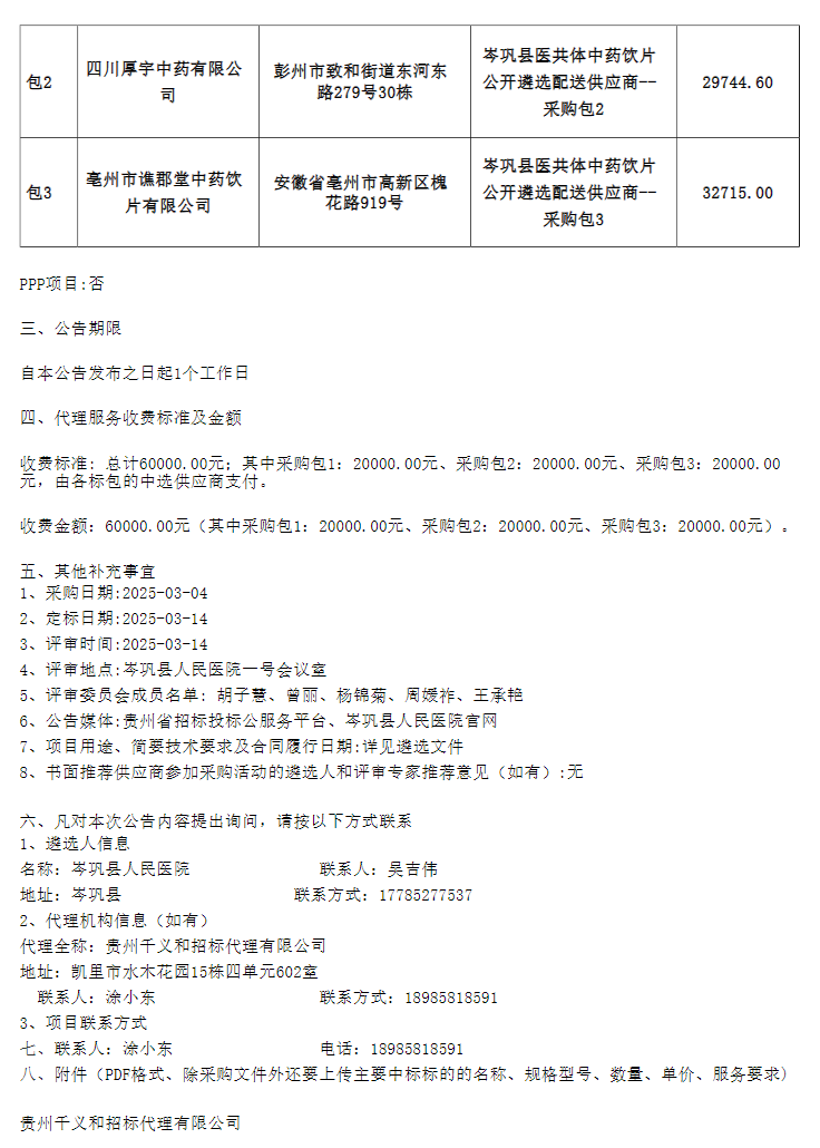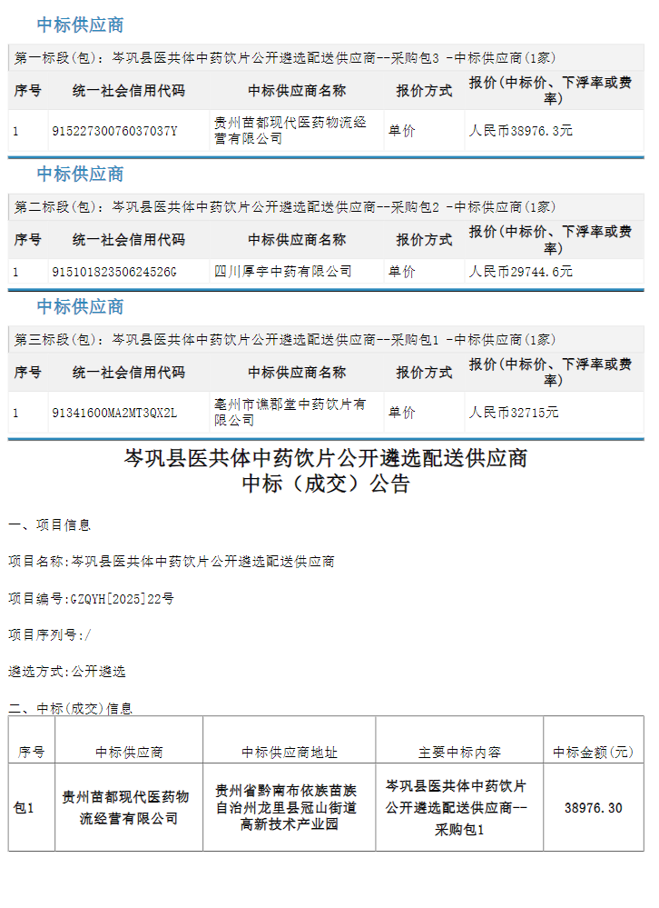 【黔东南苗族侗族自治州岑巩县人民医院】贵州省黔东南苗族侗族自治州岑巩县医共体中药饮片公开遴选配送供应商 中标(成交)公告
