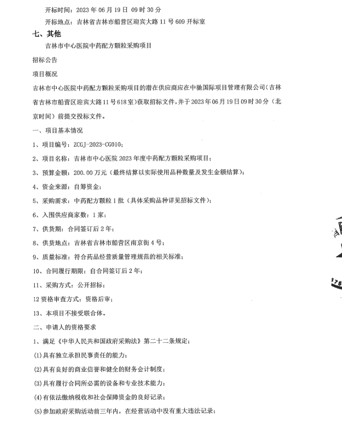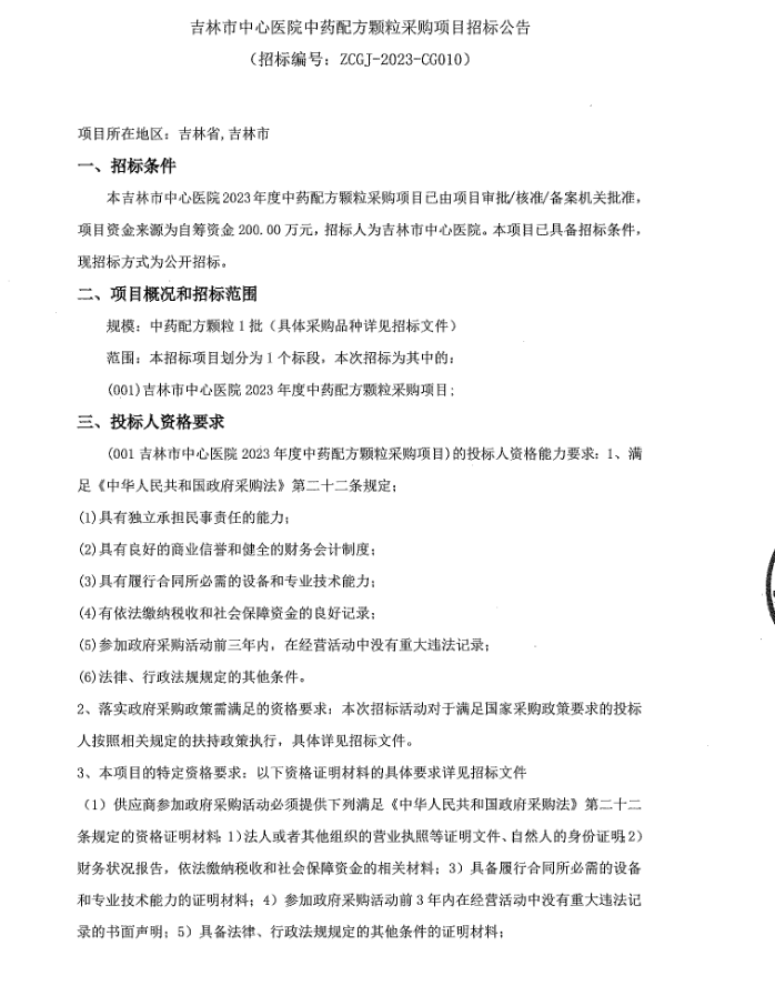 【吉林市中心医院】吉林省吉林市中心医院中药配方颗粒采购项目招标公告