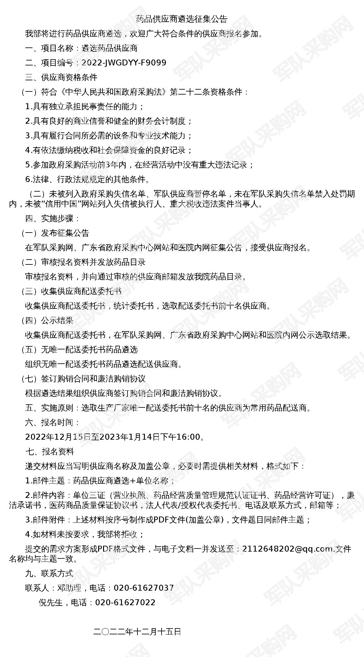 【军队采购】军队采购网药品供应商遴选征集公告(2022-JWGDYY-F9099)