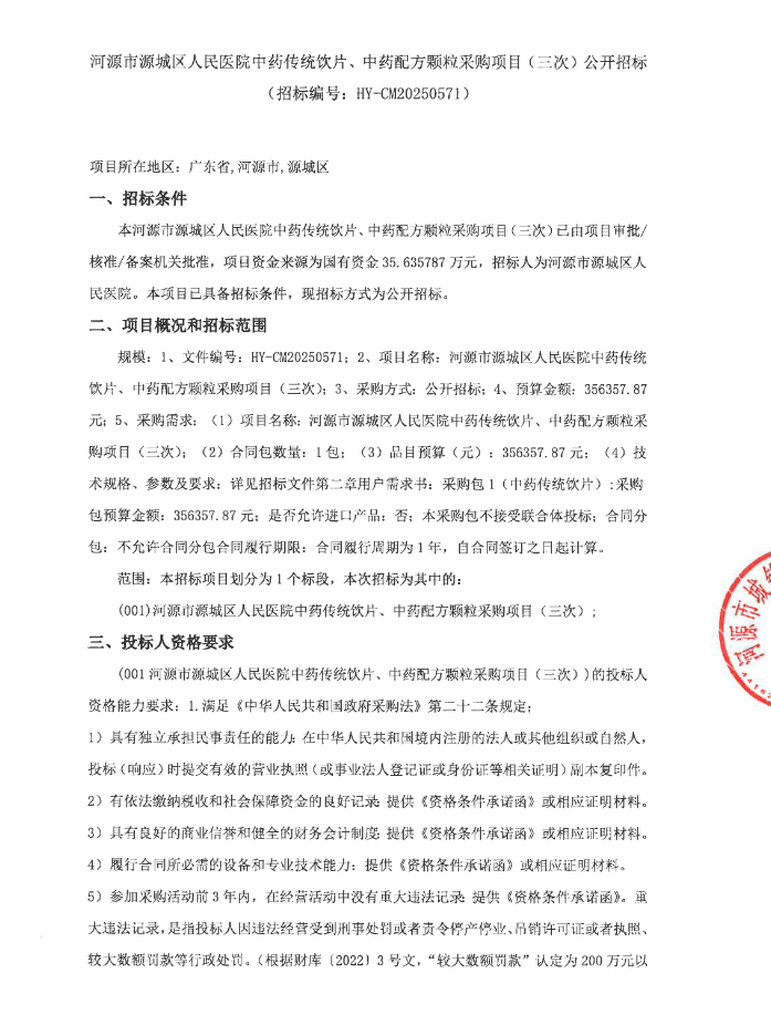 【河源市源城区人民医院】广东省河源市源城区人民医院中药传统饮片、中药配方颗粒采购项目(三次)公开招标