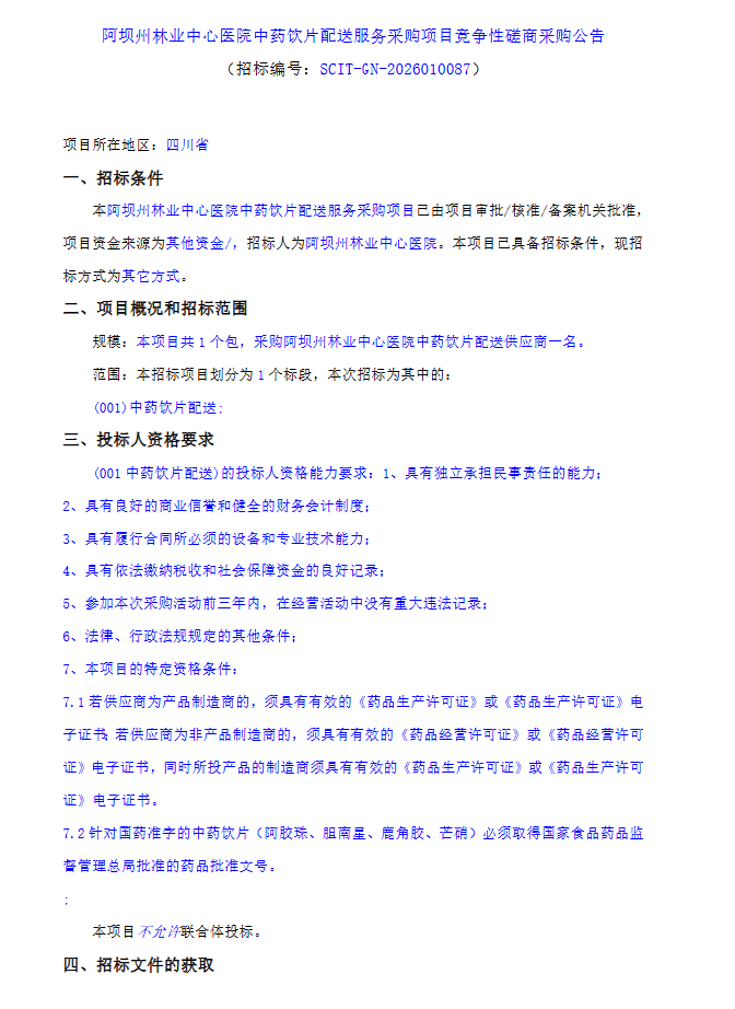 【阿坝州林业中心医院】阿坝州林业中心医院中药饮片配送服务采购项目竞争性磋商采购公告