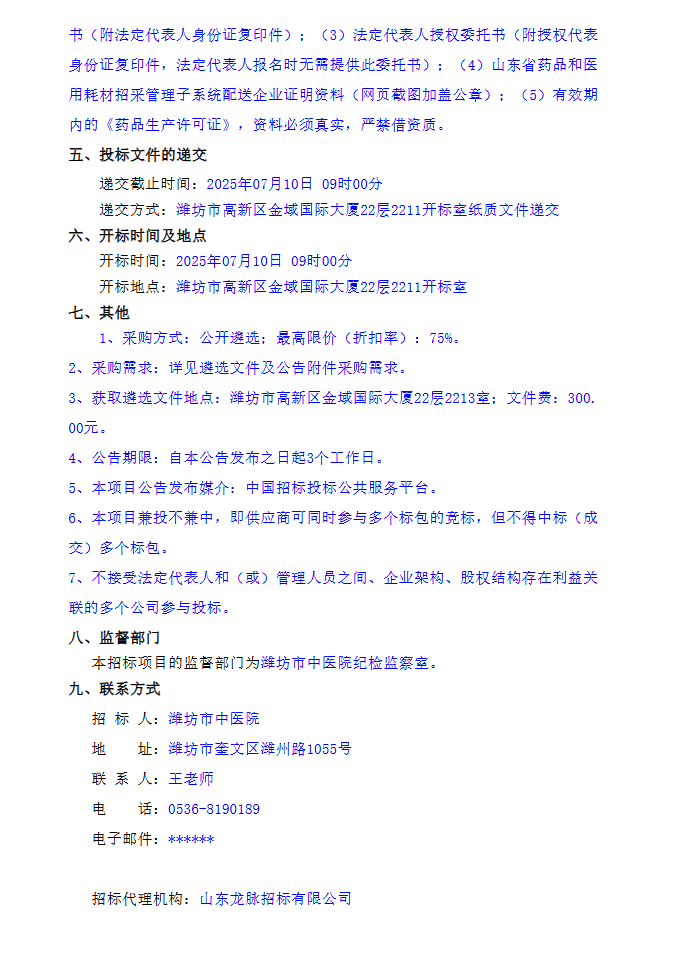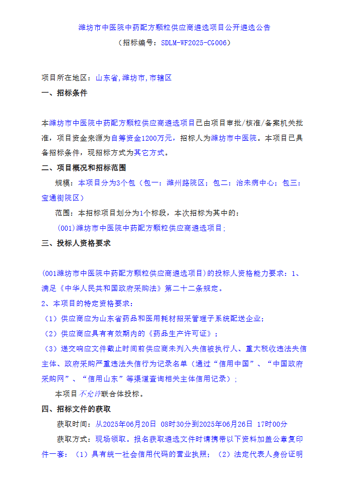 【潍坊市中医院】山东省潍坊市中医院中药配方颗粒供应商遴选项目公开遴选公告