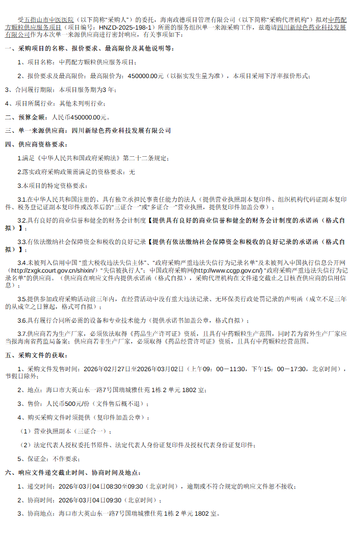 【五指山市中医医院】海南省五指山市中医医院中药配方颗粒供应服务项目-单一来源采购公告