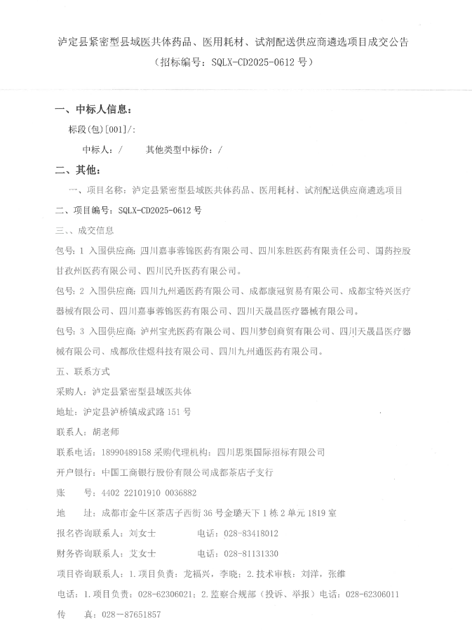 【甘孜藏族自治州泸定县人民医院】四川省甘孜藏族自治州泸定县紧密型县域医共体药品、医用耗材、试剂配送供应商遴选项目成交公告