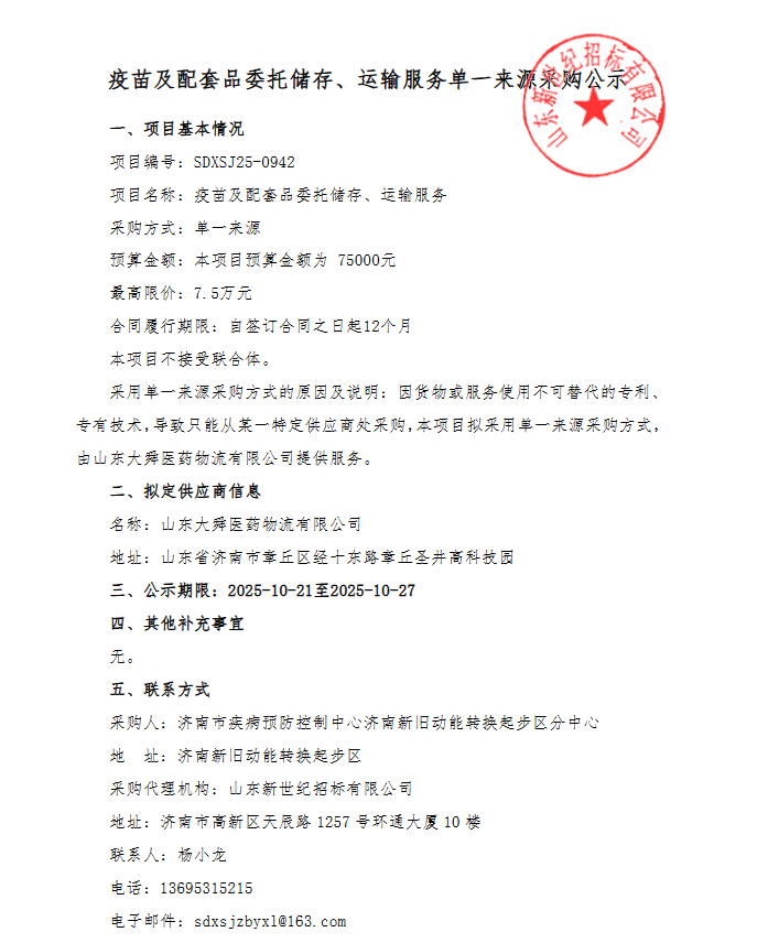 【济南市疾病预防控制中心】山东省济南市疾病预防控制中心济南新旧动能转换起步区分中心疫苗及配套品委托储存、运输服务单一来源采购公示