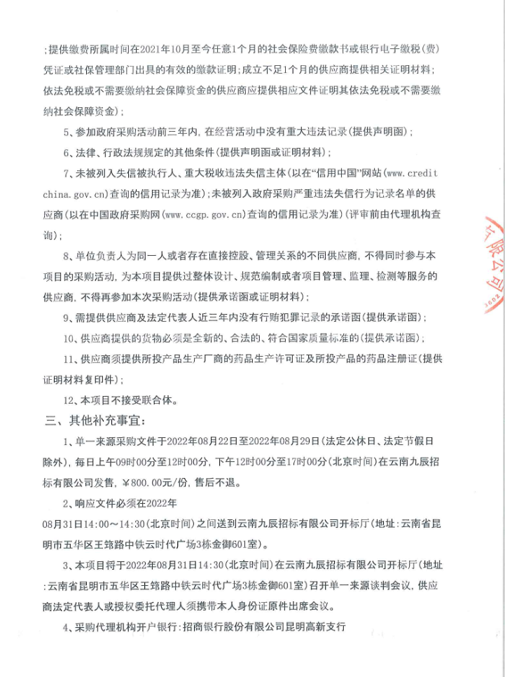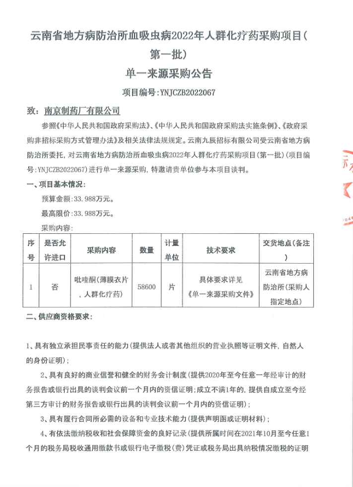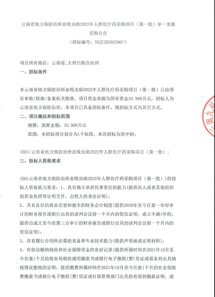 【云南省地方病防治所】血吸虫病2022年人群化疗药采购项目(第一批)单一来源采购公告