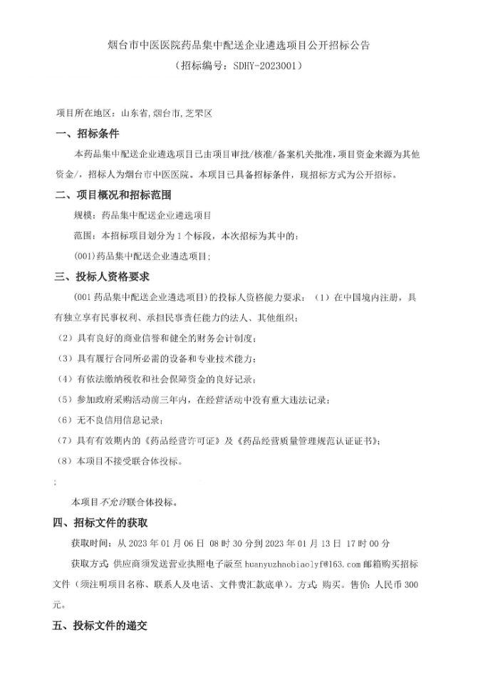 【烟台市中医医院】山东省烟台市中医医院药品集中配送企业遴选项目公开招标公告