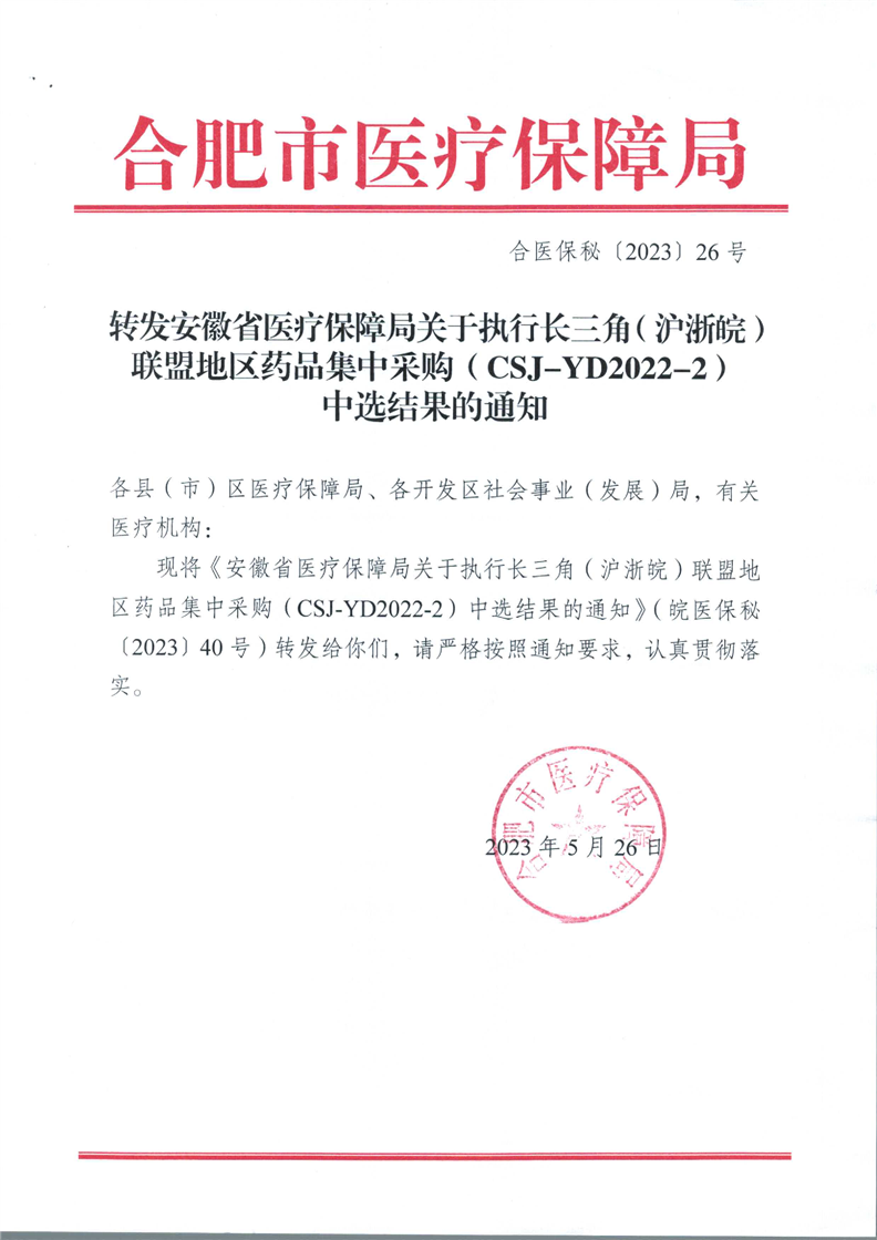 【合肥】转发安徽省医疗保障局关于执行长三角(沪浙皖)联盟地区药品集中采购(CSJ-YD2022-2)中选结果的通知