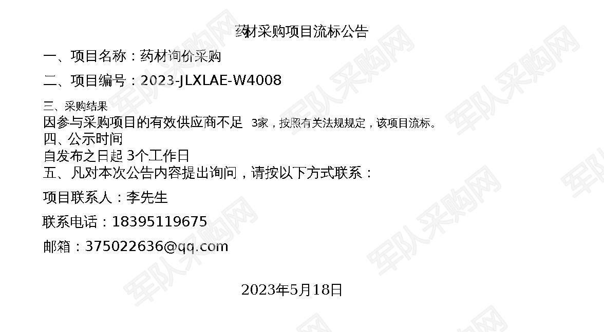 【军队采购】军队采购网药材采购项目流标公告(2023-JLXLAE-W4008)