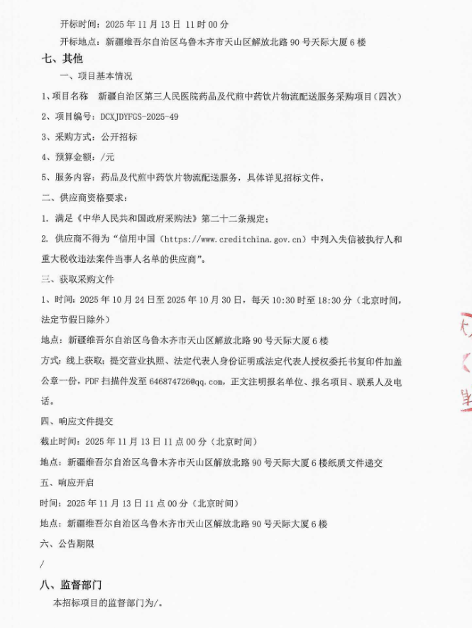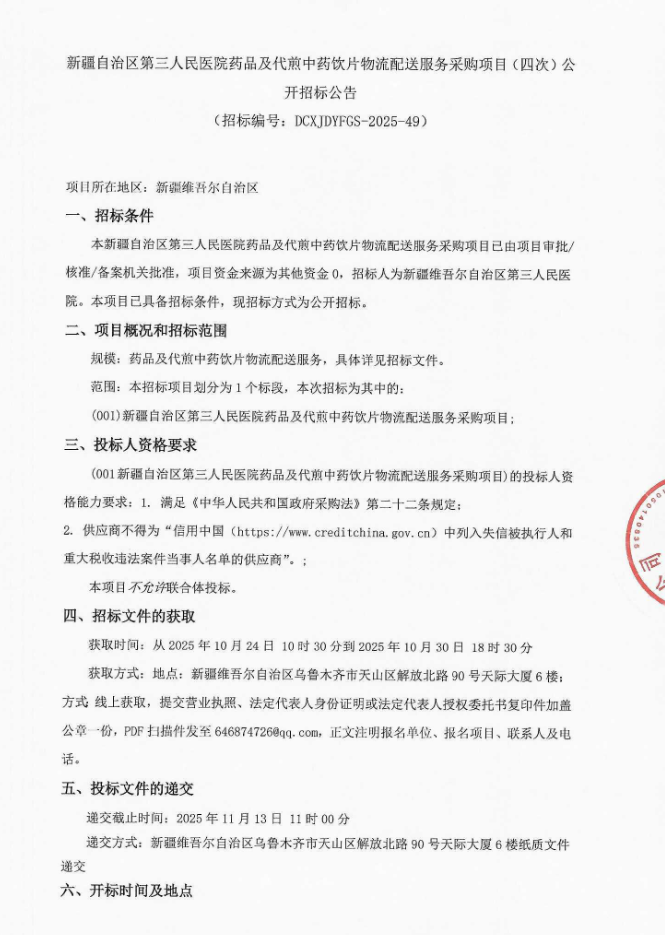【新疆维吾尔自治区第三人民医院】新疆维吾尔自治区第三人民医院药品及代煎中药饮片物流配送服务采购项目(四次)公开招标公告