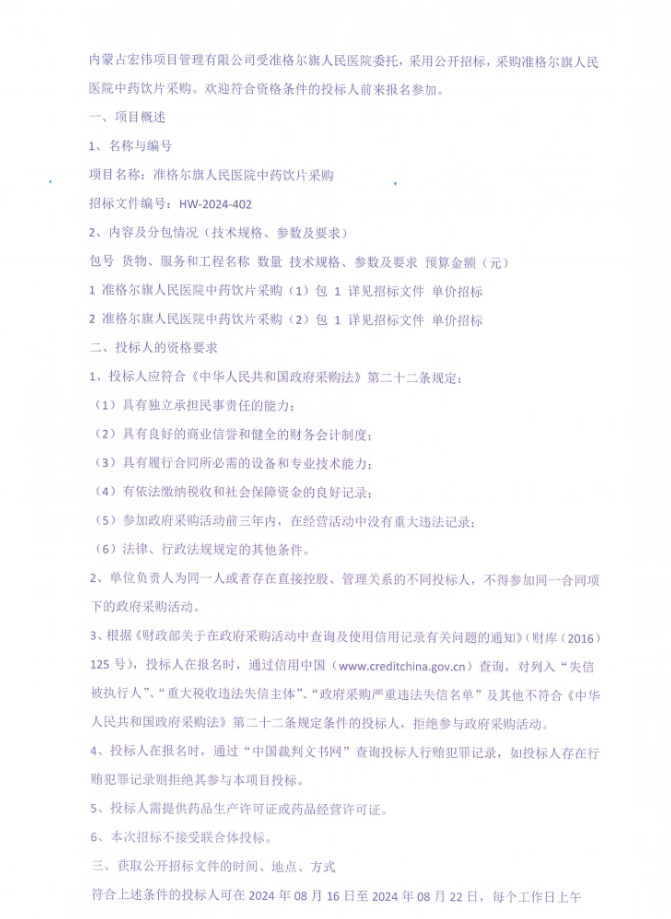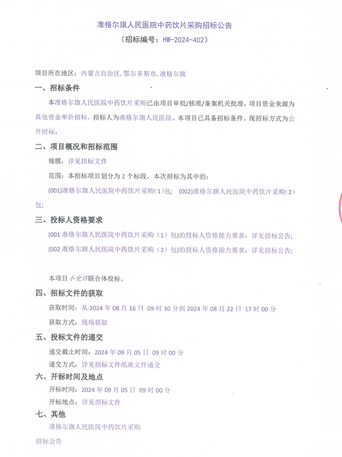 【鄂尔多斯市准格尔旗人民医院】内蒙古自治区鄂尔多斯市准格尔旗人民医院中药饮片采购招标公告