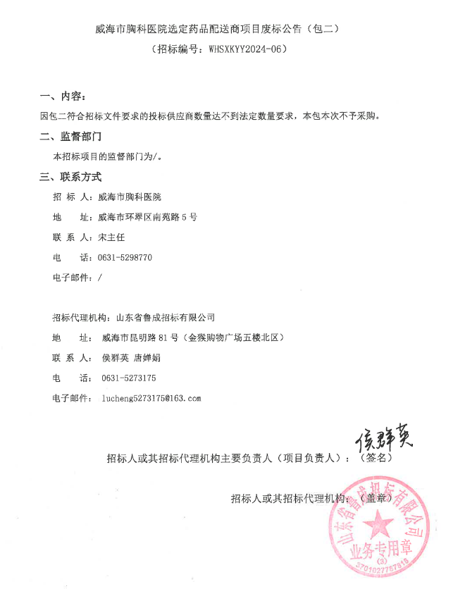 【威海市胸科医院】山东省威海市胸科医院选定药品配送商项目废标公告(包二)