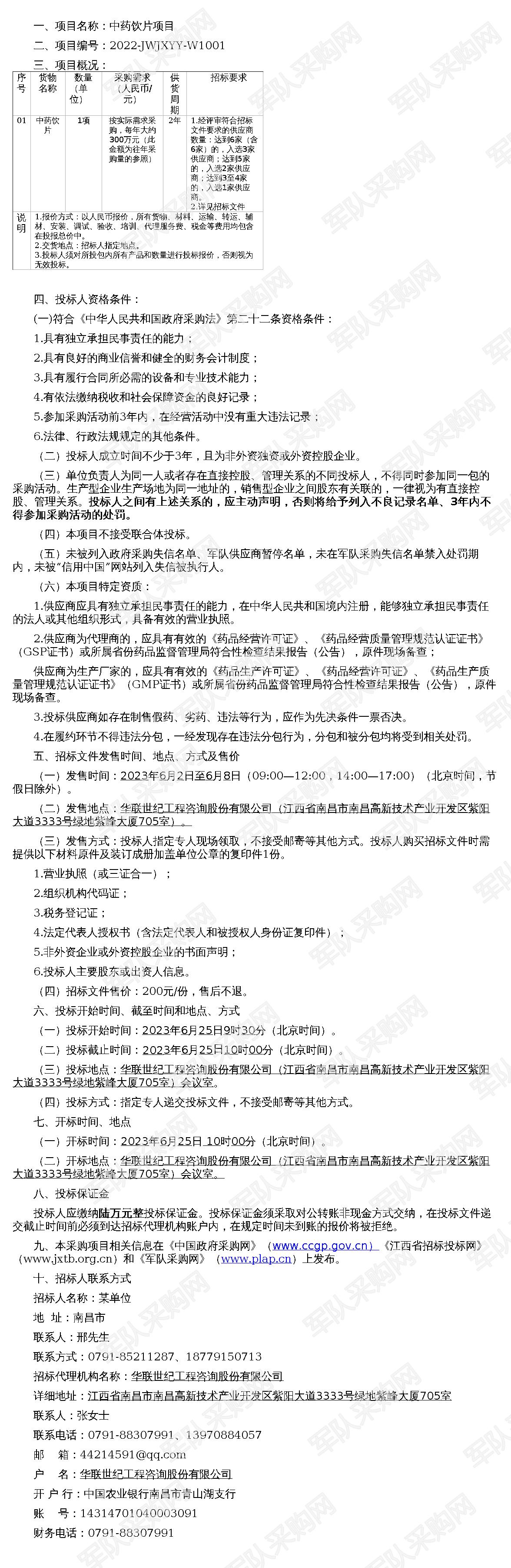 【军队采购】军队采购网某单位中药饮片项目公开招标采购公告(2022-JWJXYY-W1001)