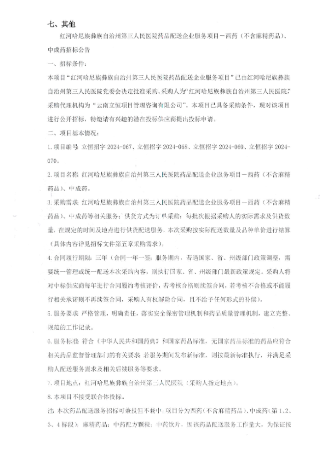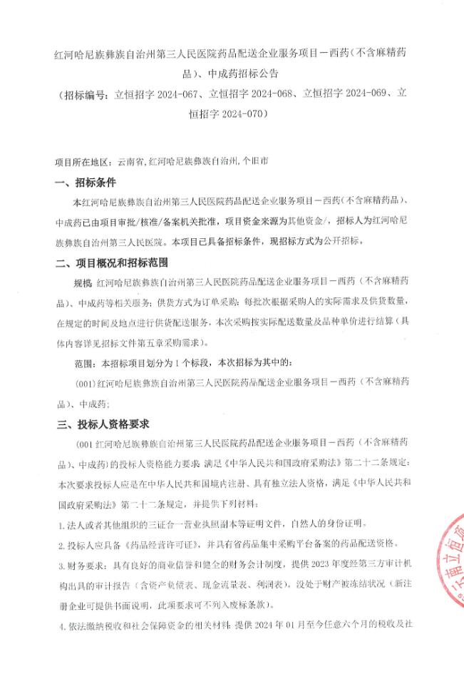 【红河哈尼族彝族自治州第三人民医院】云南省红河哈尼族彝族自治州第三人民医院药品配送企业服务项目-西药(不含麻精药品)、中成药招标公告