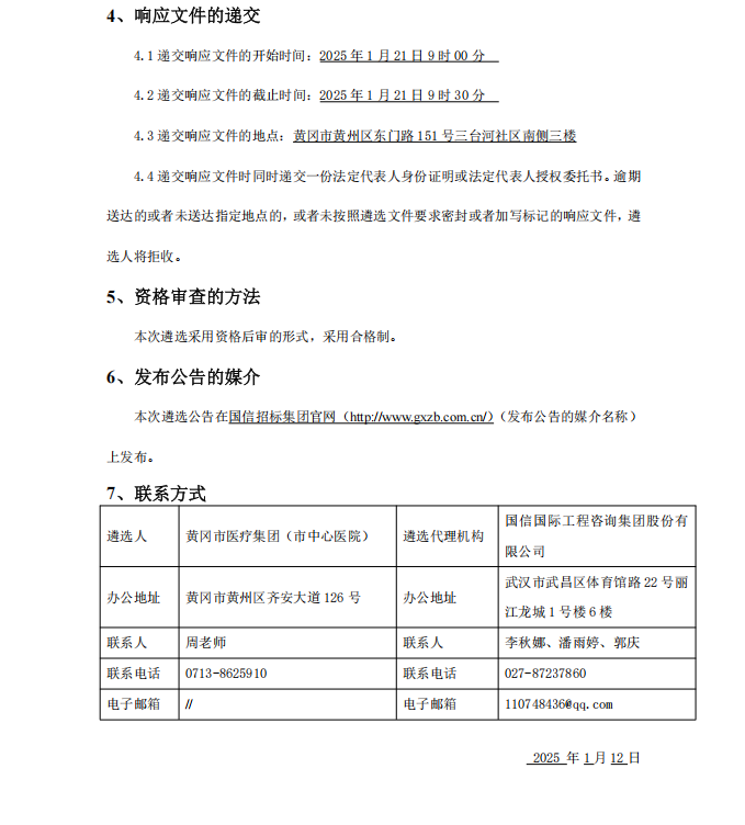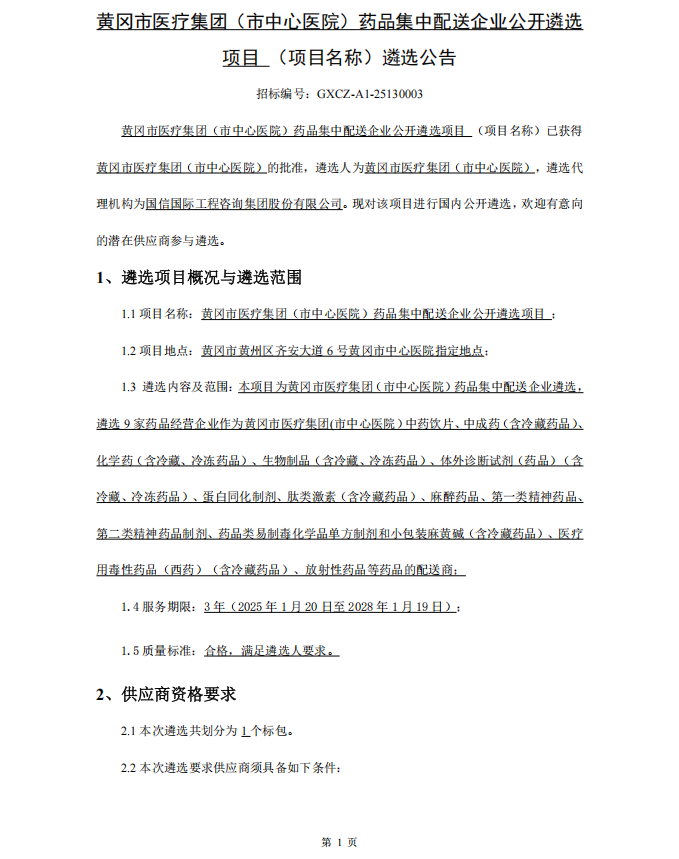 【黄冈市医疗集团】湖北省黄冈市医疗集团(市中心医院)药品集中配送企业公开遴选项目(GXCZ-A1-25130003)采购公告