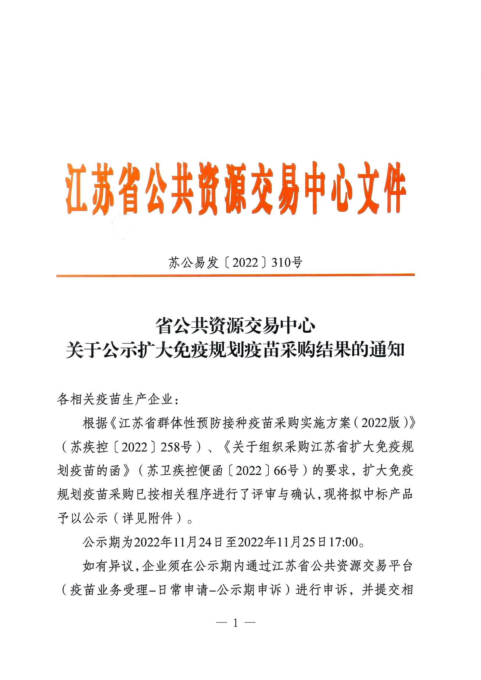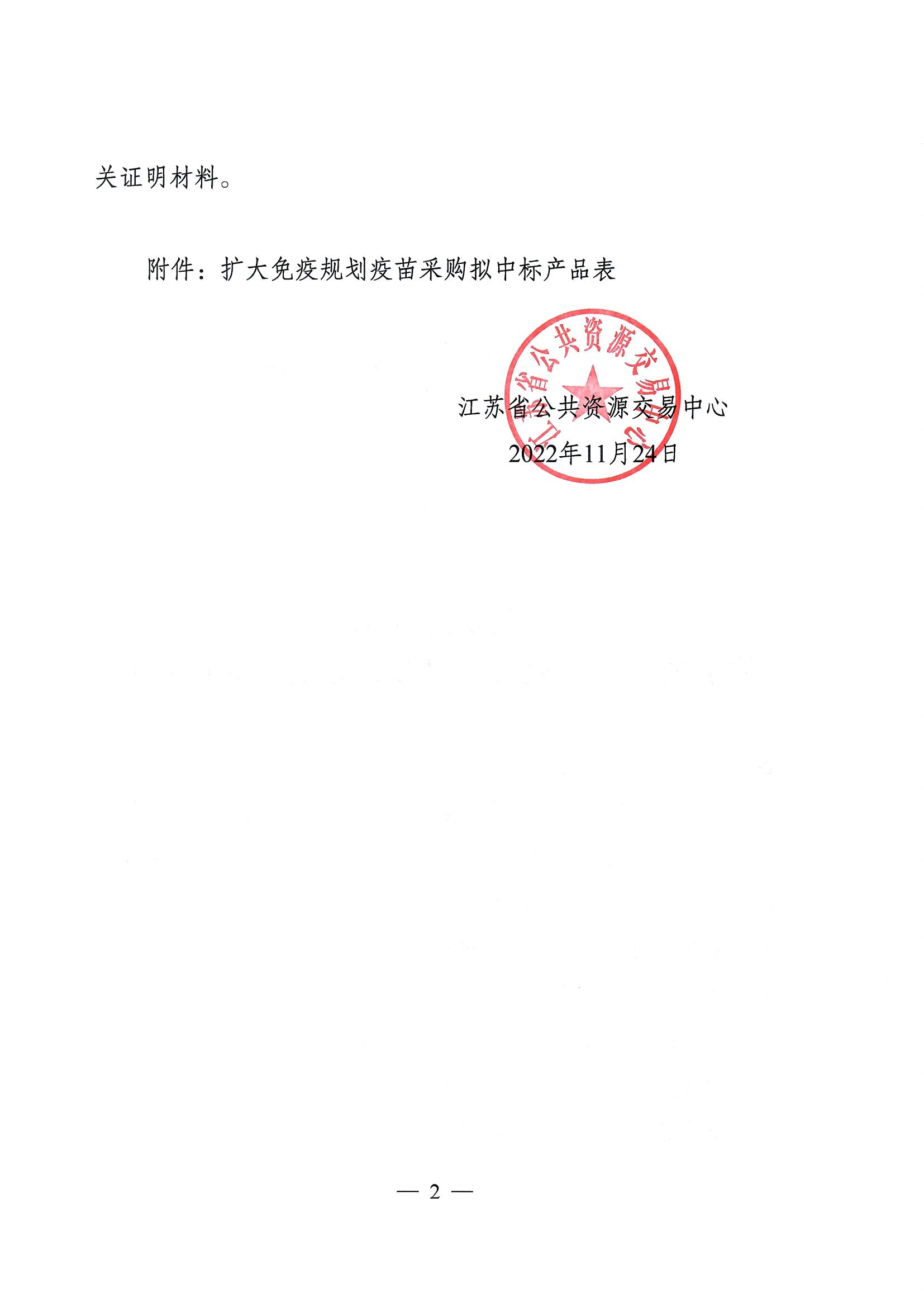 根据《江苏省群体性预防接种疫苗采购实施方案(2022版)》(苏疾控〔2022〕258号)、《关于组织采购江苏省扩大免疫规划疫苗的函》(苏卫疾控便函〔2022〕66号)的要求,扩大免疫规划疫苗采购已按相关程序进行了评审与确认,现将拟中标产品予以公示(详见附件)。