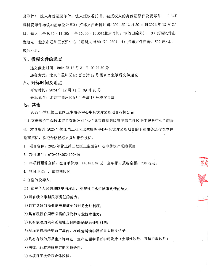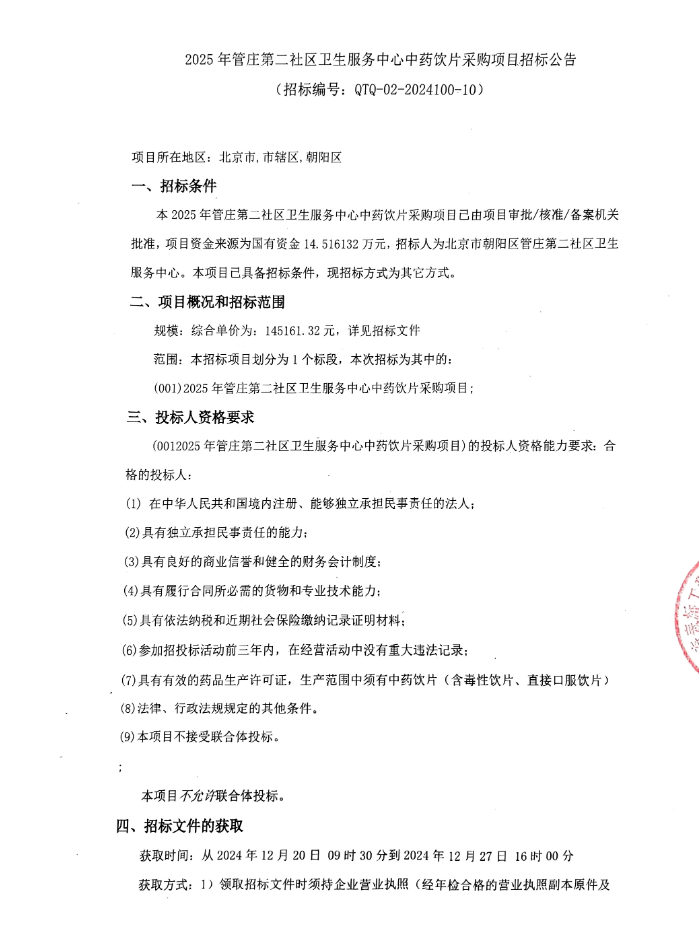 【北京市朝阳区管庄第二社区卫生服务中心】北京市朝阳区2025年管庄第二社区卫生服务中心中药饮片采购项目招标公告