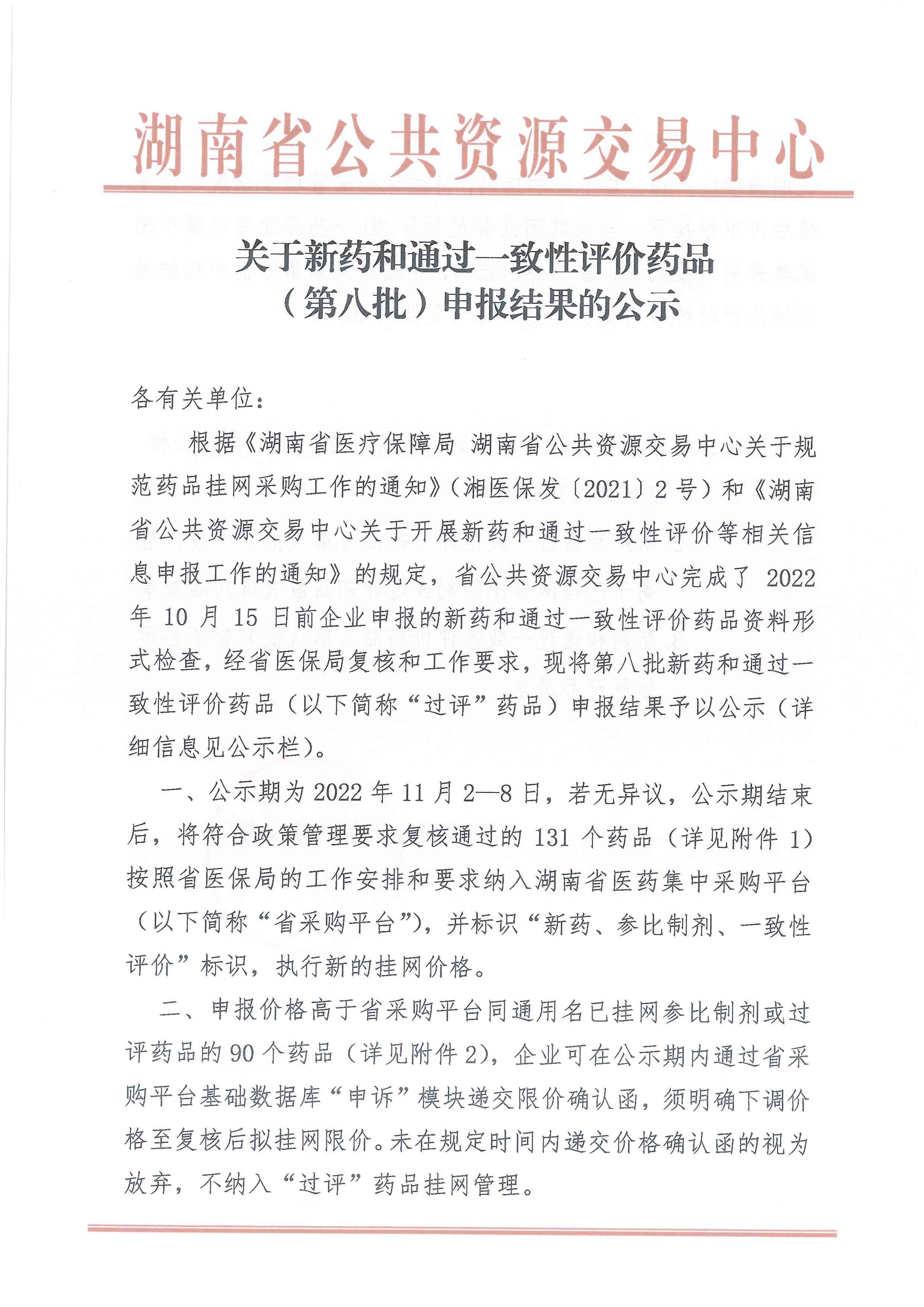 【湖南】关于新药和通过一致性评价药品(第八批)申报结果的公示