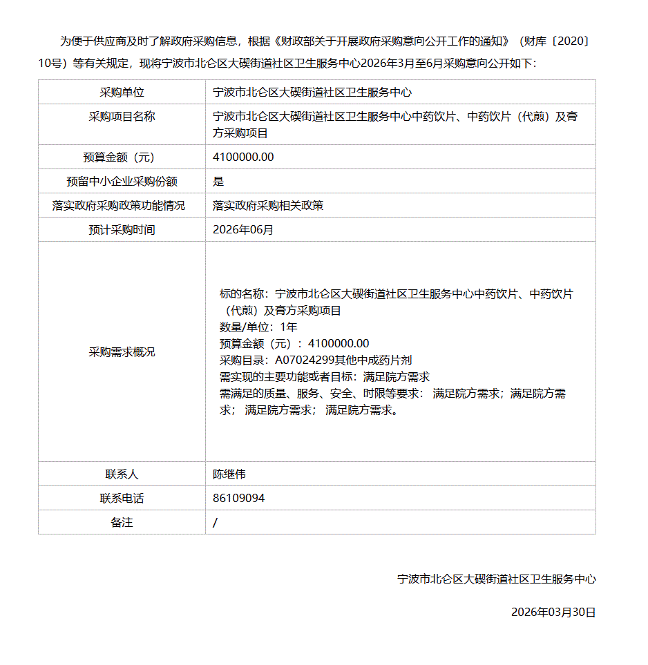【宁波市北仑区大碶街道社区卫生服务中心】浙江省宁波市北仑区大碶街道社区卫生服务中心2026年3月至6月政府采购意向