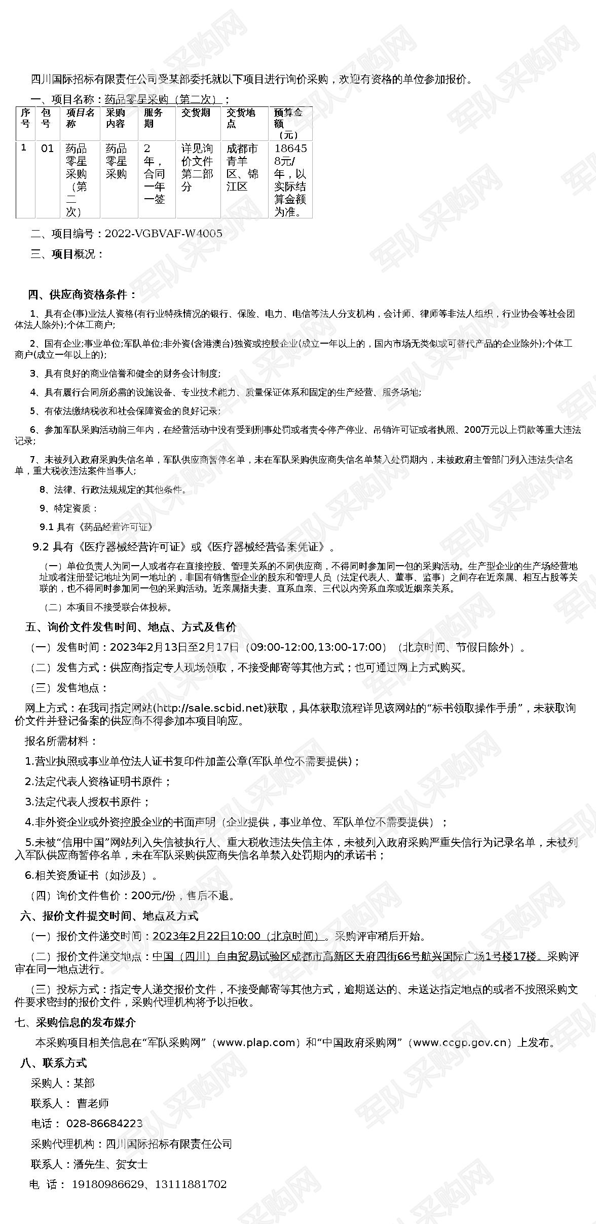 【军队采购】军队采购网某部药品零星采购(第二次)询价采购公告(2022-VGBVAF-W4005)