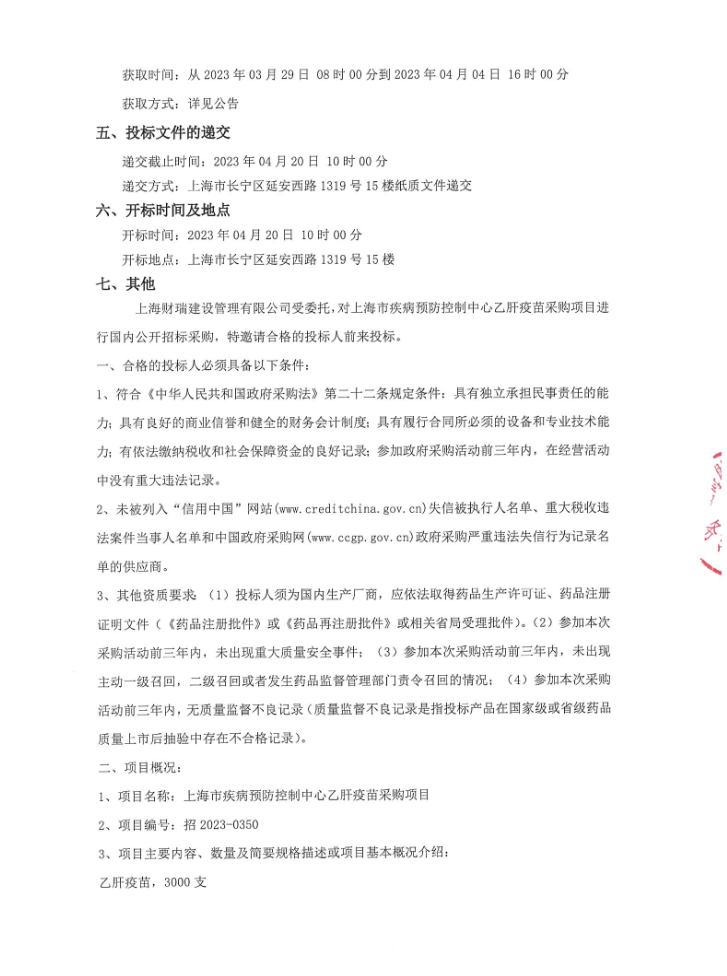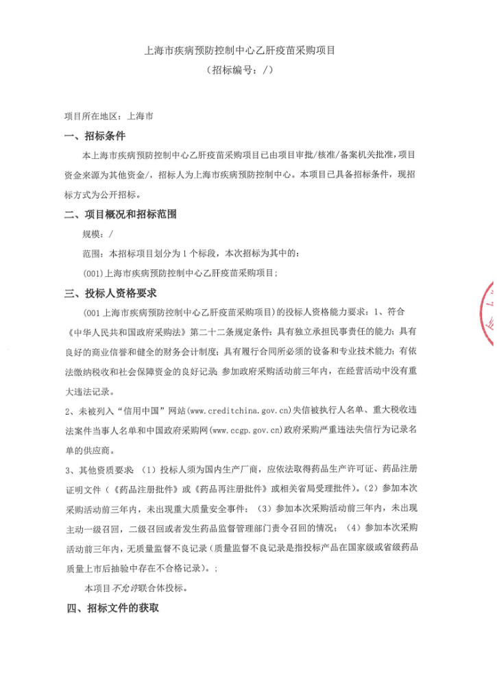 【上海市疾病预防控制中心】上海市疾病预防控制中心乙肝疫苗采购项目(20230328)