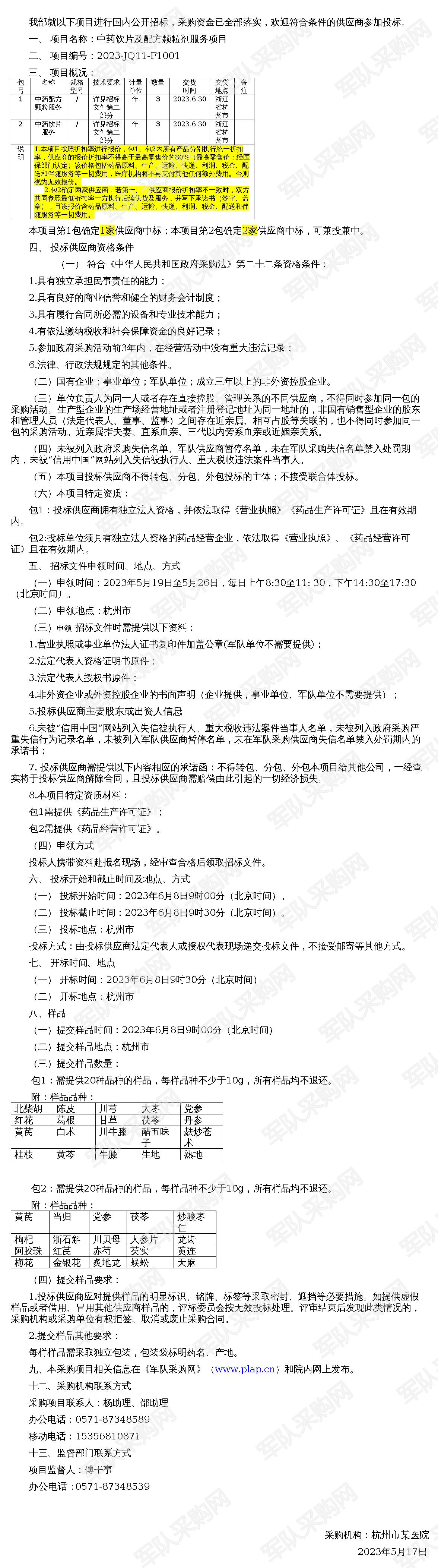 【军队采购】军队采购网中药饮片及配方颗粒剂服务项目采购公告(2023-JQ11-F1001)(20230518)
