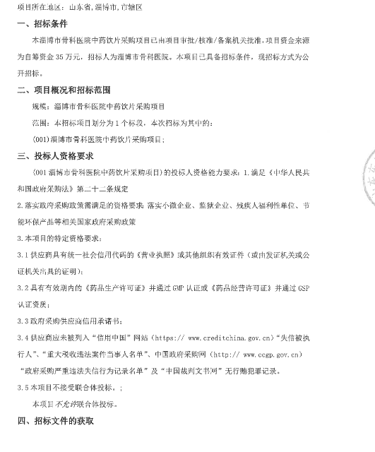 【淄博市骨科医院】山东省淄博市骨科医院中药饮片采购项目竞争性磋商