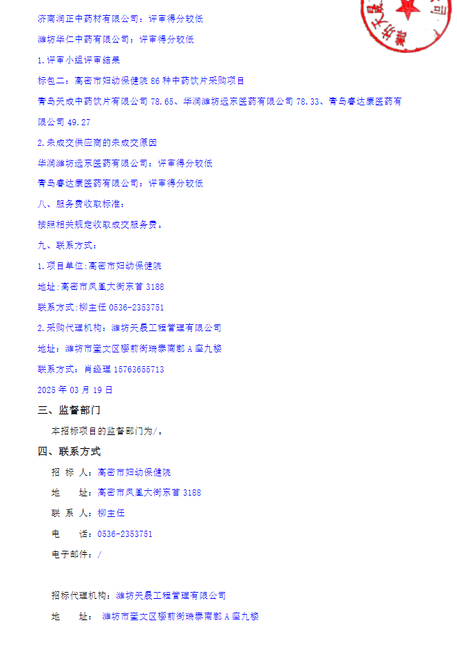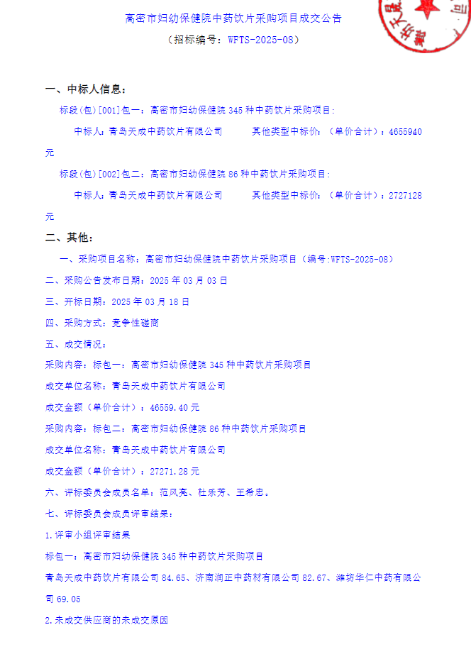 【潍坊市高密市妇幼保健院】山东省高密市妇幼保健院中药饮片采购项目成交公告