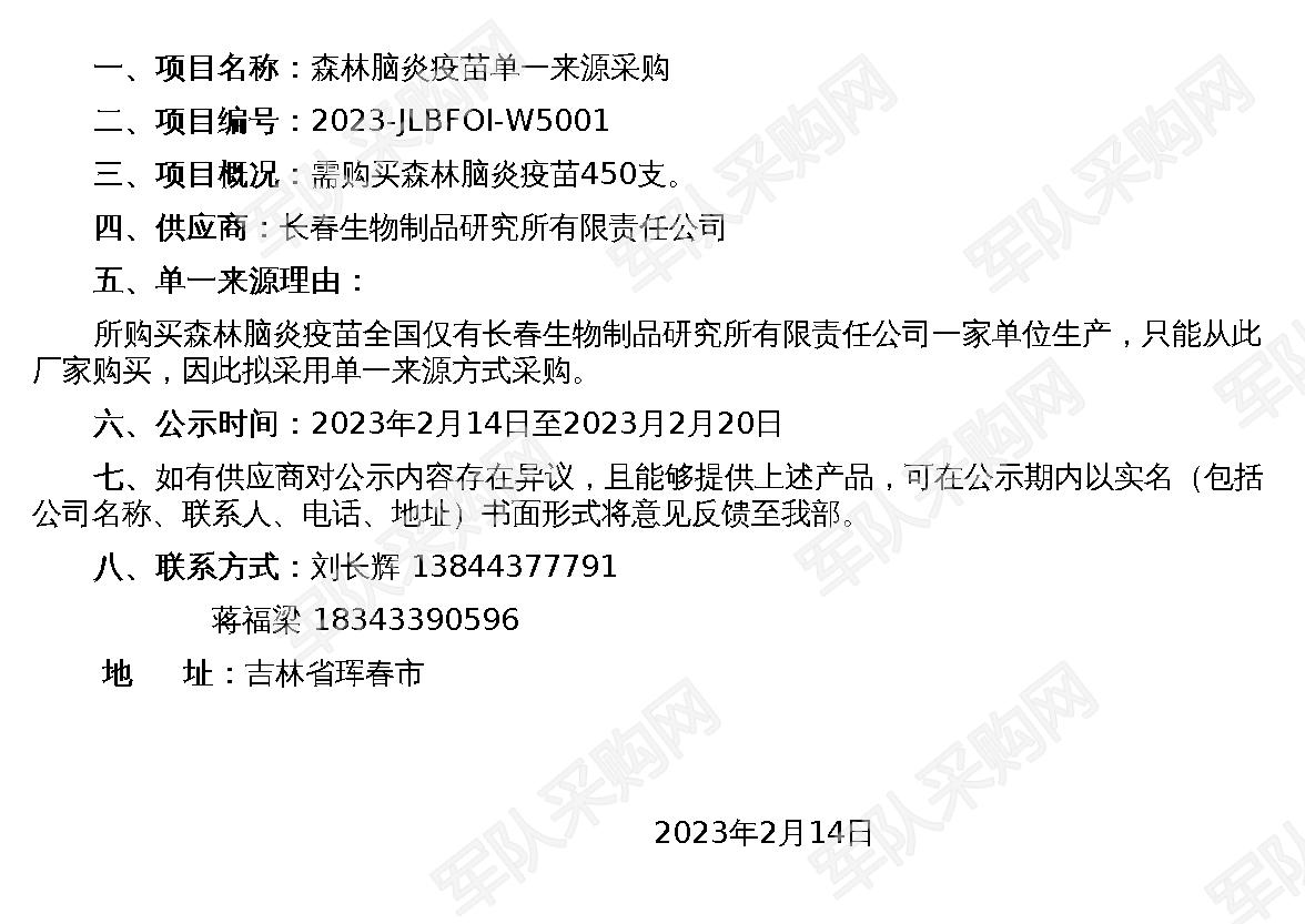 【军队采购】军队采购网森林脑炎疫苗单一来源采购公告(2023-JLBFOI-W5001)