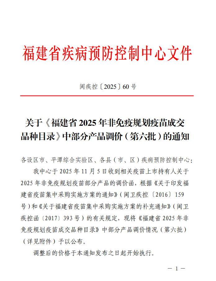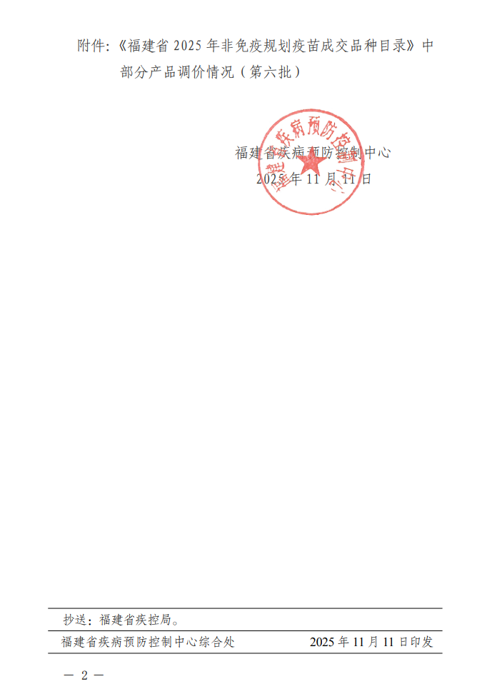 【福建】关于《福建省2025年非免疫规划疫苗成交品种目录》中部分产品调价(第六批)的通知