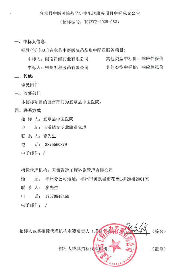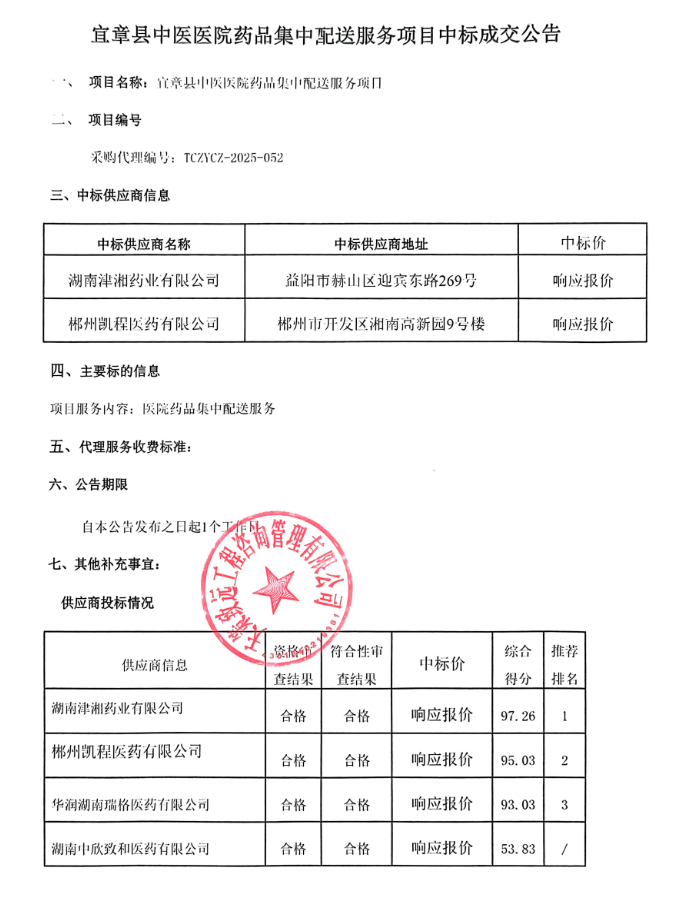 【郴州市宜章县中医医院】湖南省郴州市宜章县中医医院药品集中配送服务项目中标成交公告