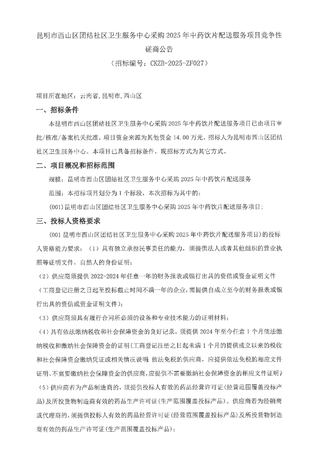 【昆明市西山区团结社区卫生服务中心】云南省昆明市西山区团结社区卫生服务中心采购2025年中药饮片配送服务项目竞争性磋商公告